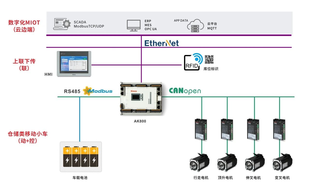 控制器采用CANopen或者EtherCAT总线控制伺服,车辆以及系统状态信息采集到HMI显示,万象城官网awc物联型HMI支持OPC UA、MQTT、数据库等多种通讯方式,可通过以太网连接至服务器,为数字化提供基础数据。